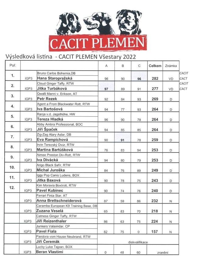Dne 1.10.22 se konalo MR Dobrmanů současně s již tradičně otevřeným závodem (s výjimkou NO a BO) dle IGP-1, IGP-2 a IGP-3 o tituly CACT, CACIT , který opět pořádal ve Všestarech na fobalovém hřišti Boxerklub v čele s manželi Fagošovými.