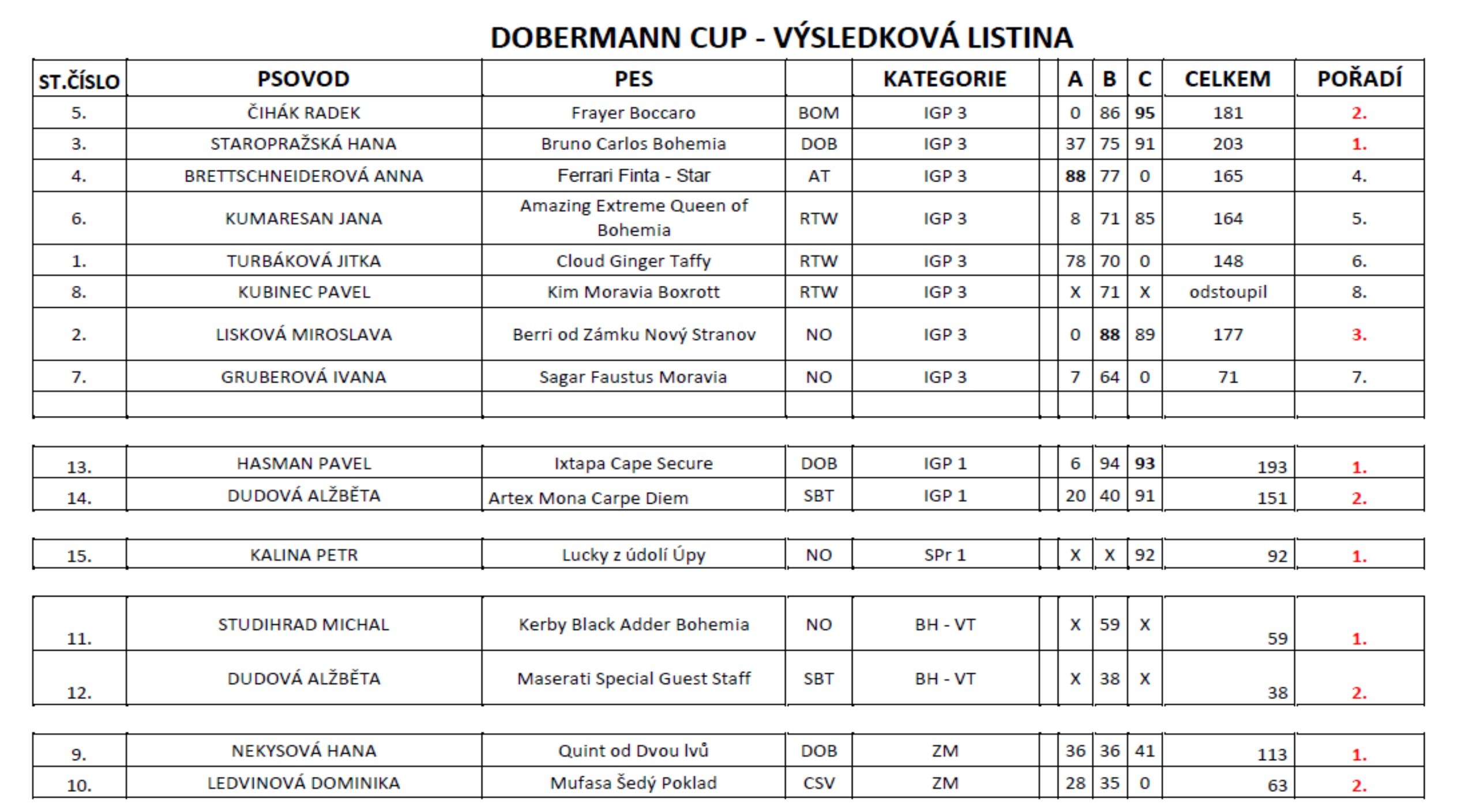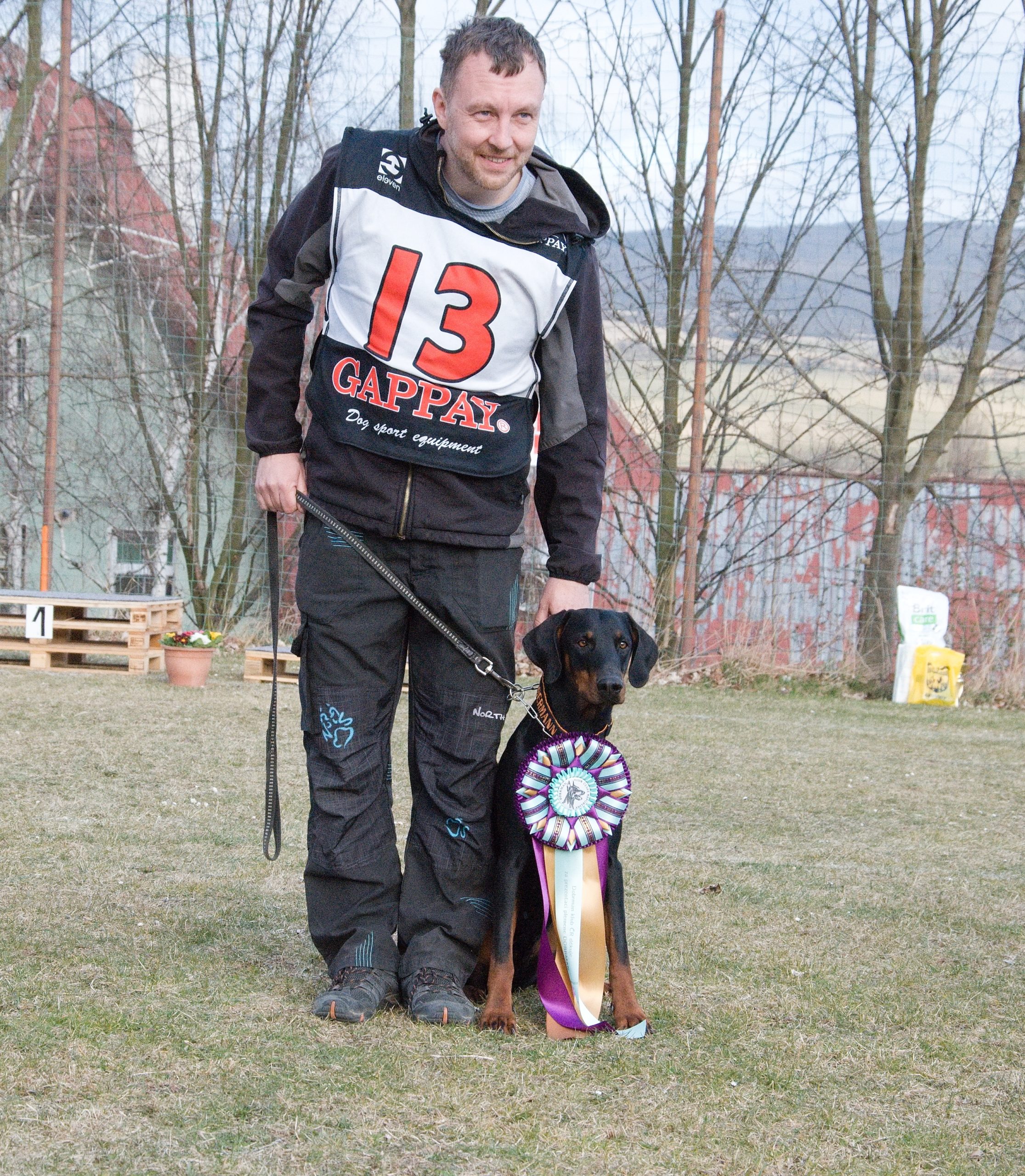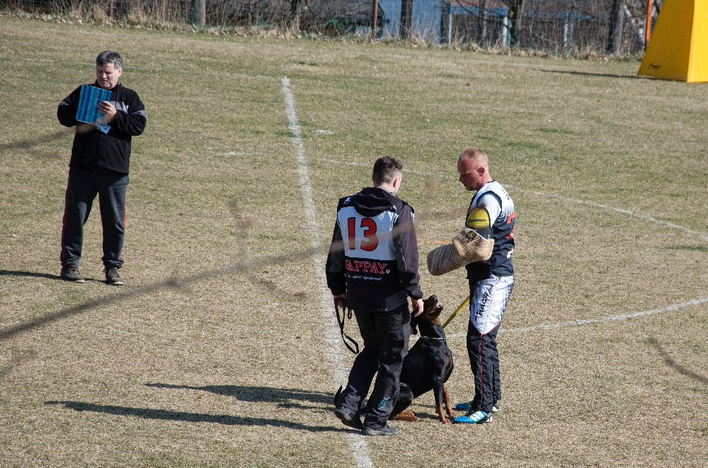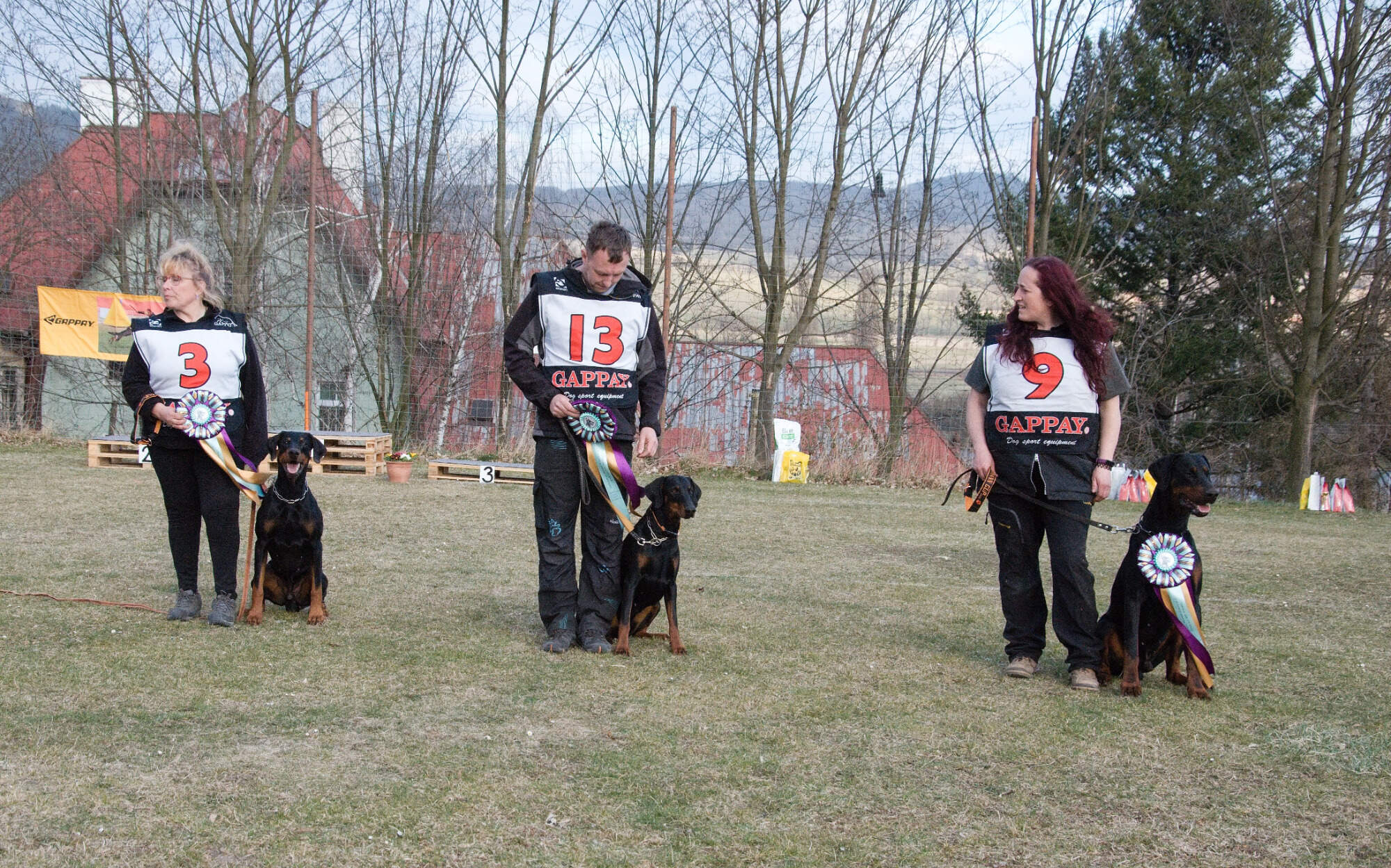 Obsazení závodu nebylo početně hodně obsazené, avšak k první akci tohoto druhu se sešlo celkem 6 plemen a 8 psovodů v nejvyšší kategorii IGP3 .Závod byl se zapsáním zkoušky, ale bohužel se po zimě některým moc nezadařilo a tak ze tří dobrmanů splnil zkoušku v kategorii ZM , ve které nastoupili, pouze dobrman Quint od Dvou lvů p.Nekysové , v IGP1 fenka Ixtapa Cape Secure